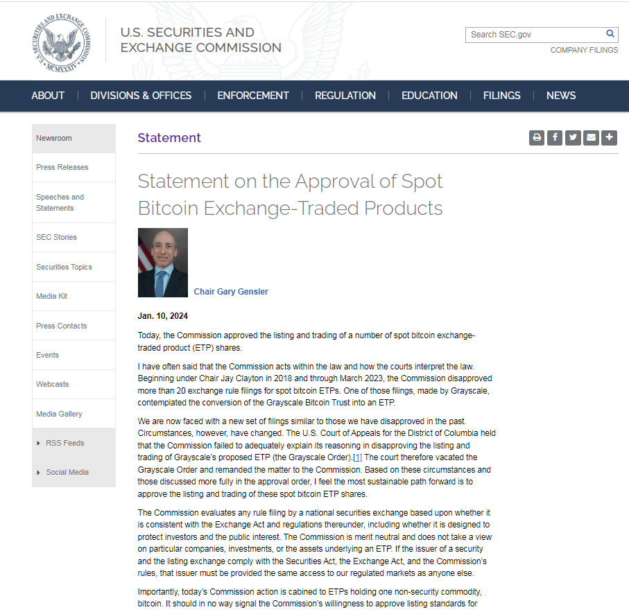 美国证交会(SEC)主席根斯勒在SEC网站发布了关于批准比特币现货ETF的声明。美国证交会主席根斯勒表示,尽管我们在周三批准了一些比特币现货ETF的上市和交易,但我们并未批准或认可比特币。比特币是一种投机性、波动性较大的资产。比特币现货ETF的获批将带来更多监管。